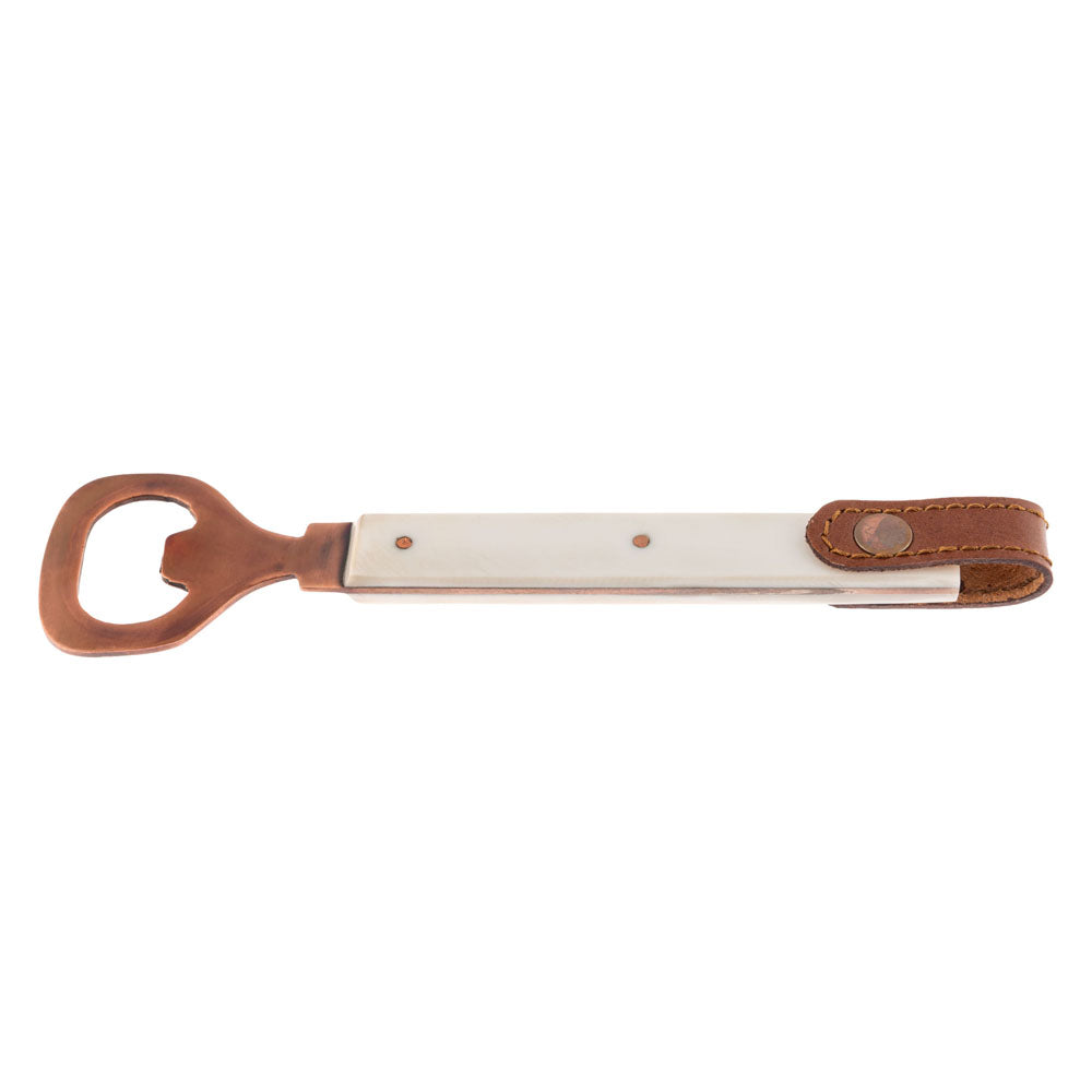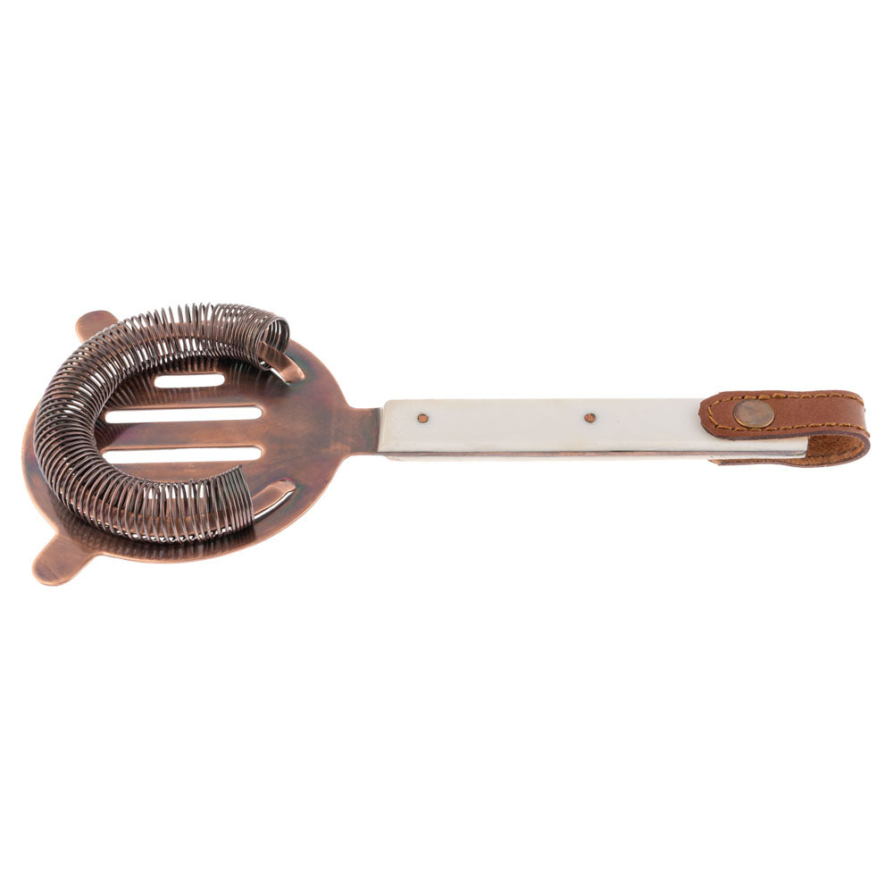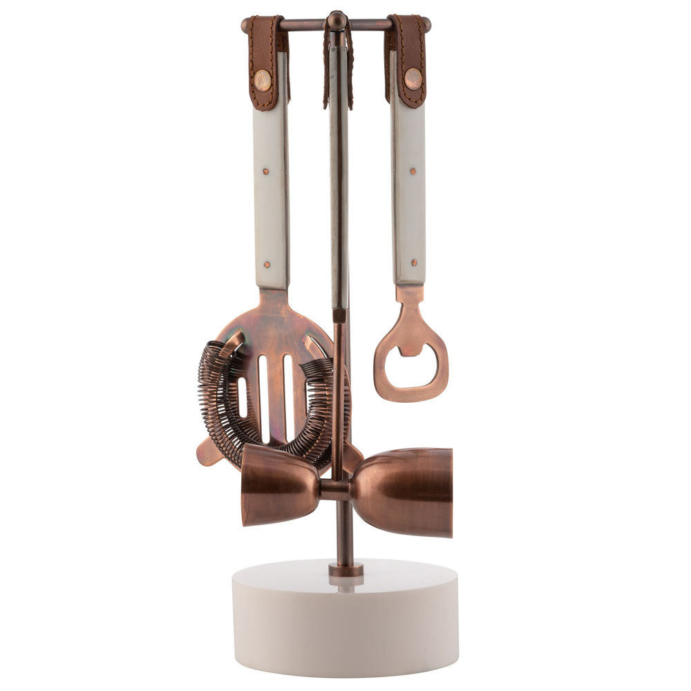 Add some whimsy to your bar top with this set of 3 ivory resin bar tools! Made with stainless steel, resin, and leather with a copper finish, these tools come with a stylish stand for easy access. Perfect for adding a touch of folklore to your cocktail-making routine. Cheers!