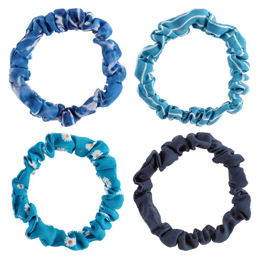 Take your updo to the next level with these slim scrunchie hair sets. Each set includes four varied and themed scrunchie patterns made with a soft polyester material. Accessorize ponytails, top knots or wear on your wrist to brighten up an outfit and add a hint of texture.