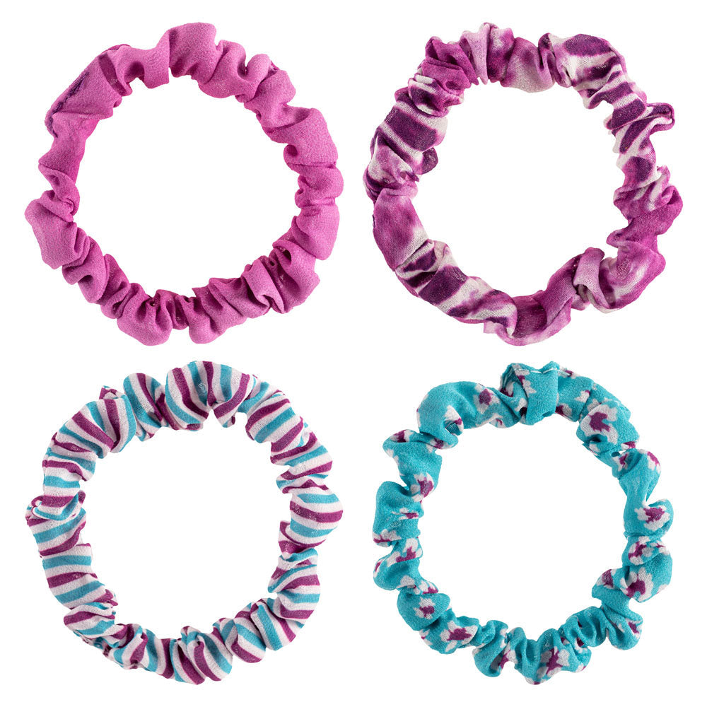 Take your updo to the next level with these slim scrunchie hair sets. Each set includes four varied and themed scrunchie patterns made with a soft polyester material. Accessorize ponytails, top knots or wear on your wrist to brighten up an outfit and add a hint of texture.