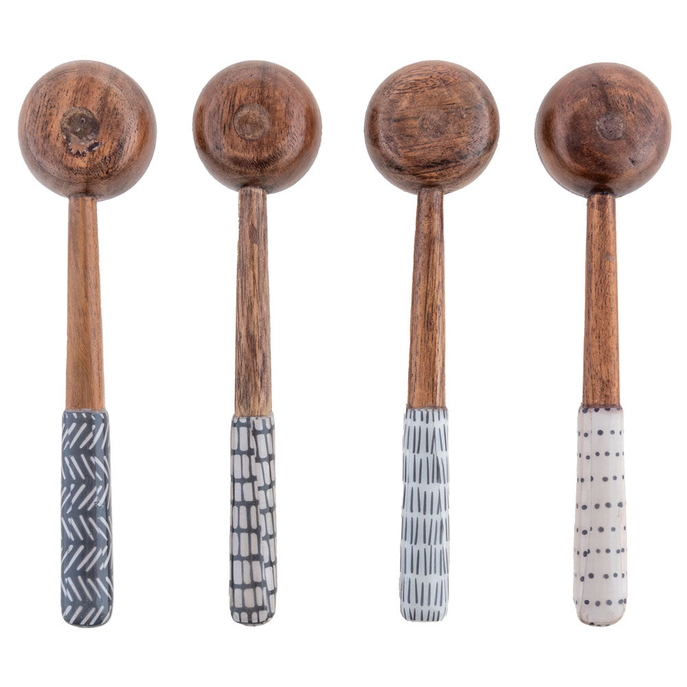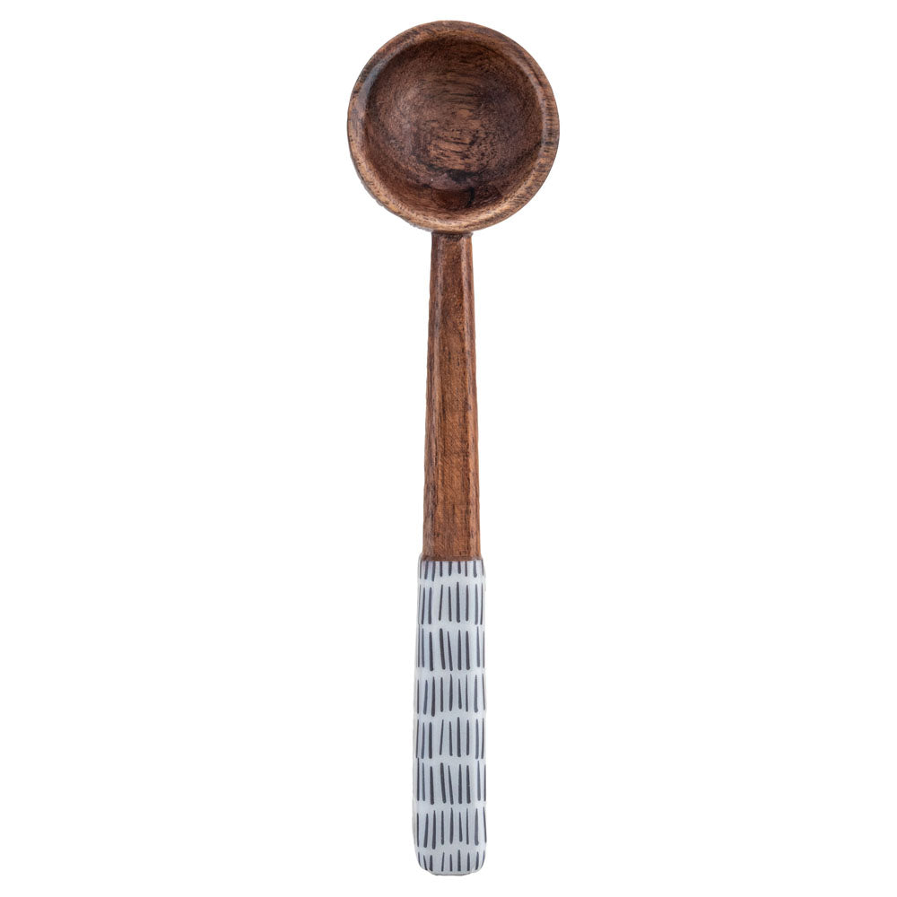 Wooden spoons with an enamel-accented handle are a sweet and modern touch to a farmhouse-style kitchen. Adorned with four distinct patterns, these tasting spoons are a fun and unique way to add spice to your cooking. Beautiful to display, these wooden and enamel spoons are both functional and stylish. Due to the artisan nature of this product each item may vary slightly.