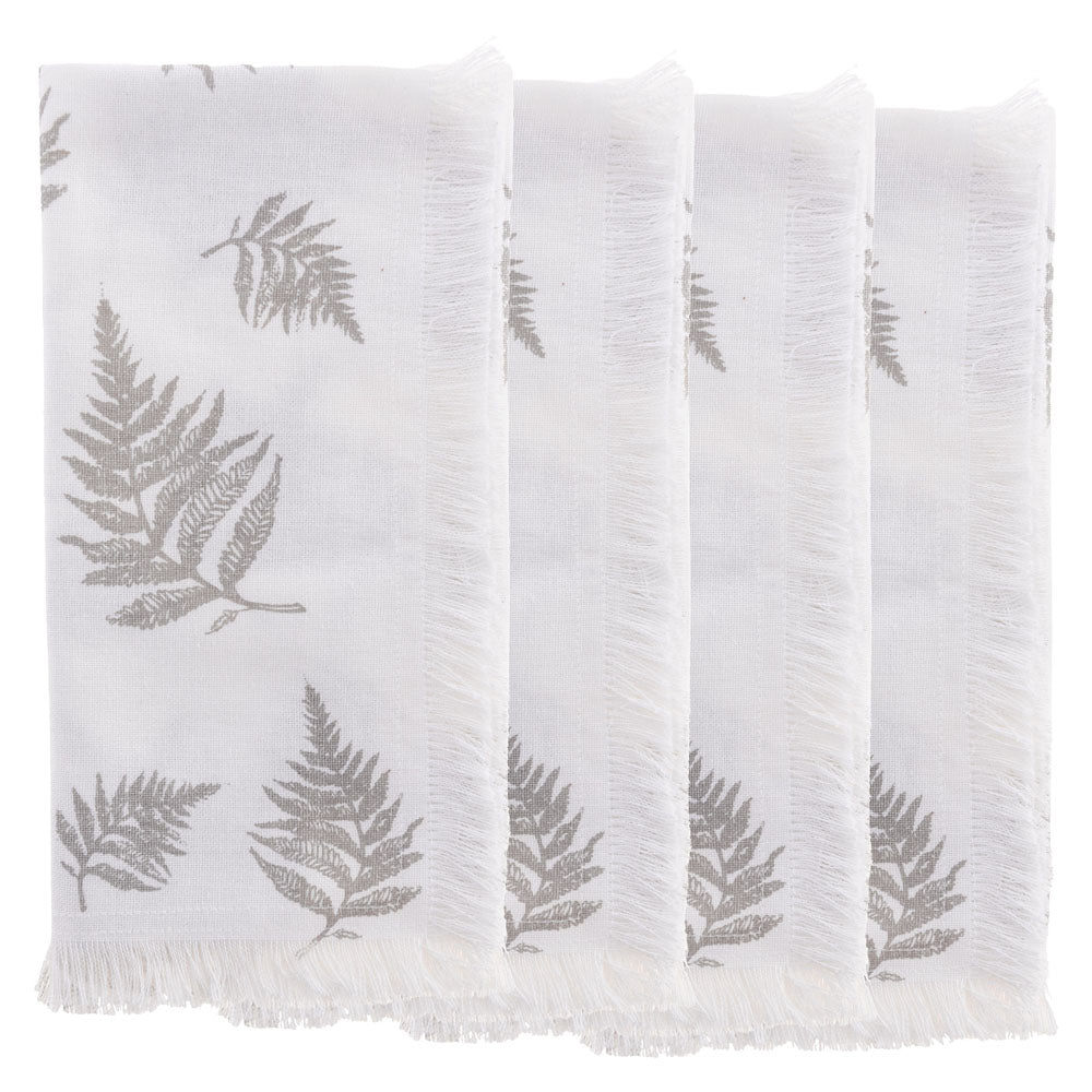 Fern dinner napkins with fringed edges bring a natural element to the table. Made from soft cotton and detailed with screen printed grey fern leaves this set of four napkins will add sophistication to any meal and pairs beautifully with our pressed flower napkin sets or fringed table runners.