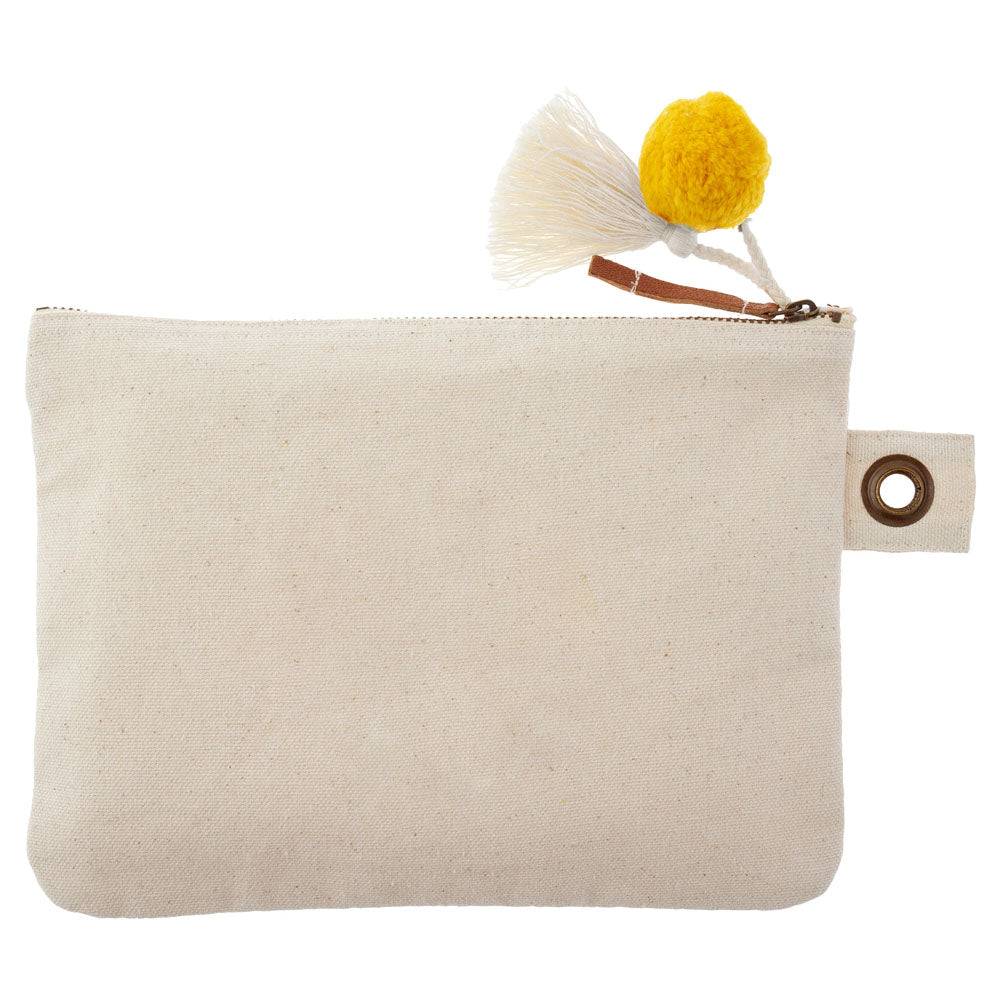 Our Canvas Carry All is perfect for all your smaller items that need organization or a place to stay together with confidence. For work, school, or travel, never lose anything essential again. Made from 100% cotton canvas material with a wipeable polyester lining to ensure easy cleaning. Store all your makeup essentials without worry. This zipper pouch includes a colorful pompom and tassel attached to the zipper pull.