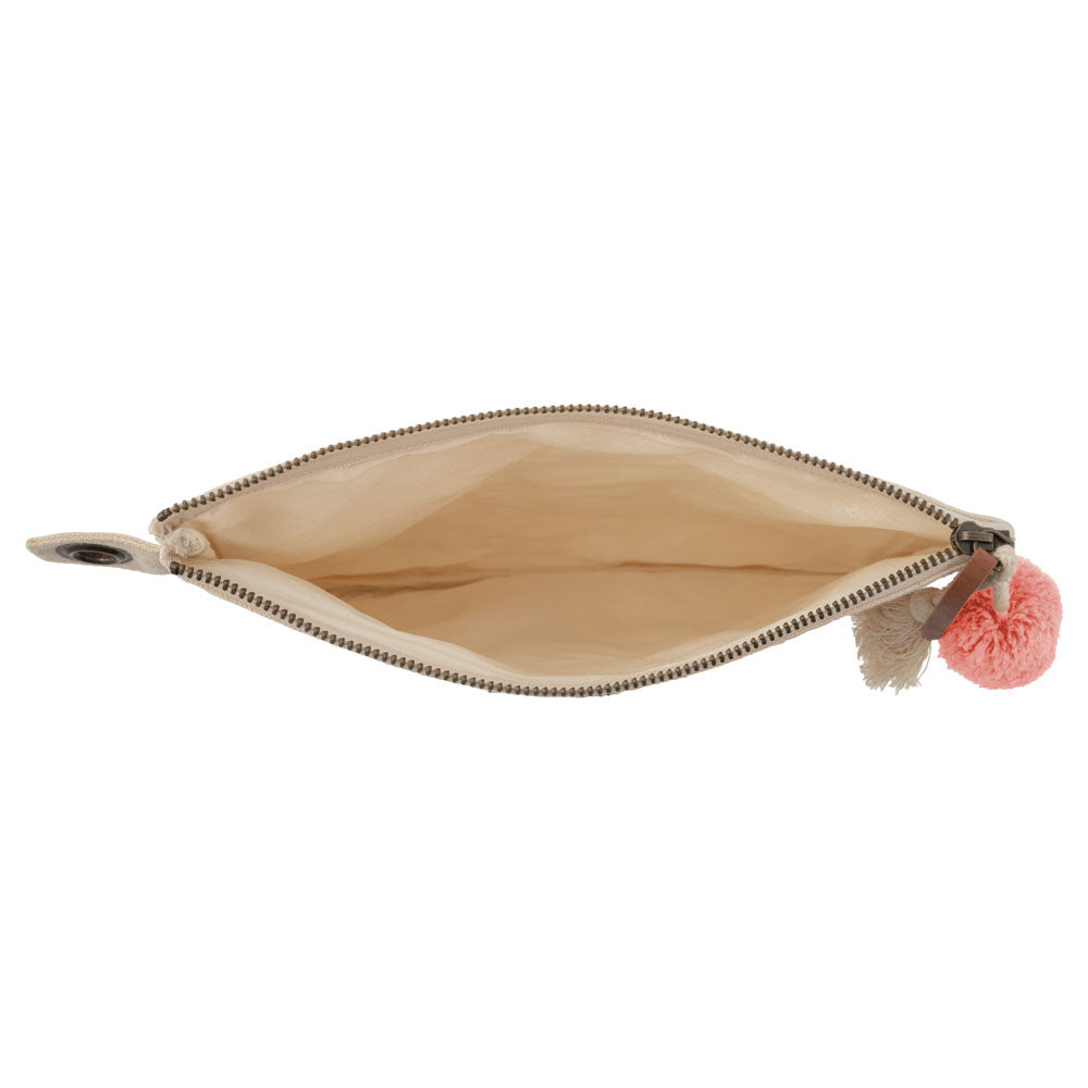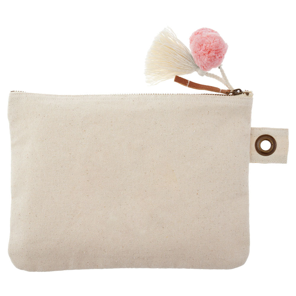 Our Canvas Carry All is perfect for all your smaller items that need organization or a place to stay together with confidence. For work, school, or travel, never lose anything essential again. Made from 100% cotton canvas material with a wipeable polyester lining to ensure easy cleaning. Store all your makeup essentials without worry. This zipper pouch includes a colorful pompom and tassel attached to the zipper pull.